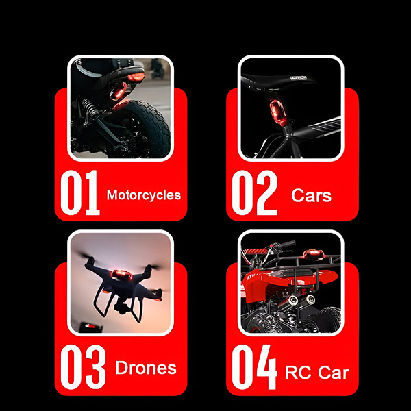 Tato světla jsou neuvěřitelně univerzální a jsou navržena tak, aby se hodila do automobilů, motocyklů, jízdních kol a dronů. Vyberte si mezi metodami instalace na suchý zip a gumový kroužek pro bezpečné a jednoduché nastavení. Nepotřebujete žádné složité nářadí ani odbornou pomoc.