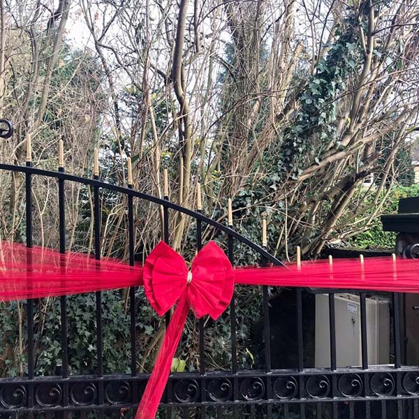 Provlékněte stuhu otvory ve dveřích, překřižte, zavažte mašli a zajistěte sponkami.