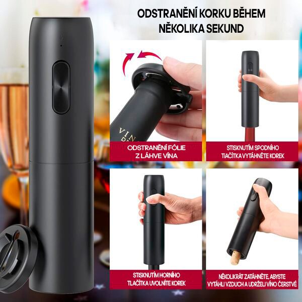 Pouhým stisknutím tlačítka vyjmete jakýkoli korek během několika sekund, takže si budete moci více užívat víno a méně času strávit zápasem s lahví.